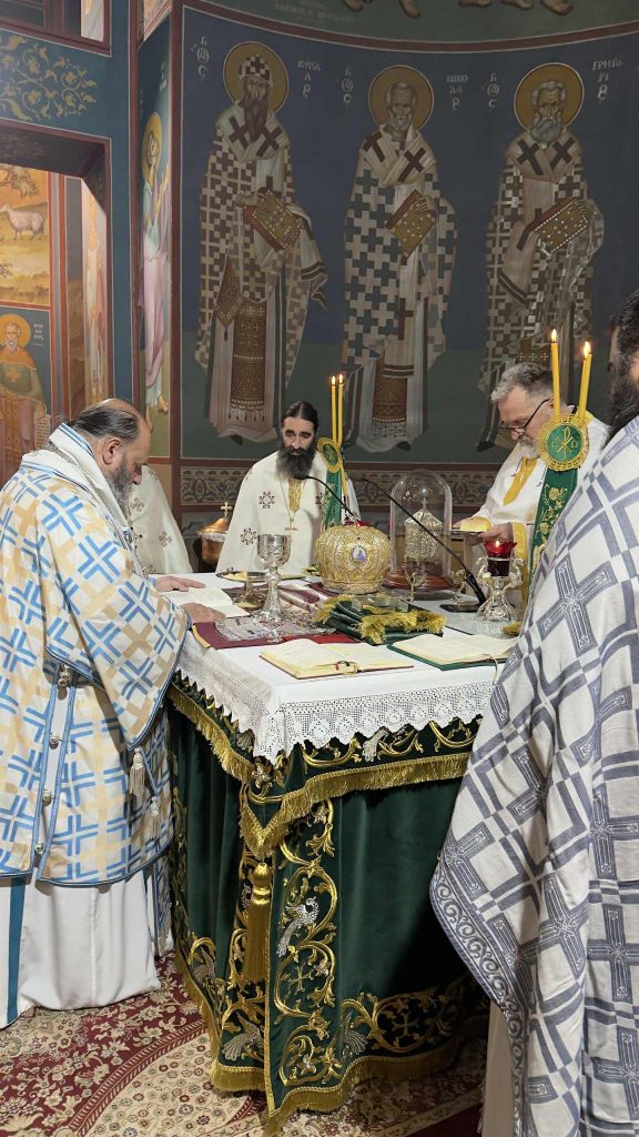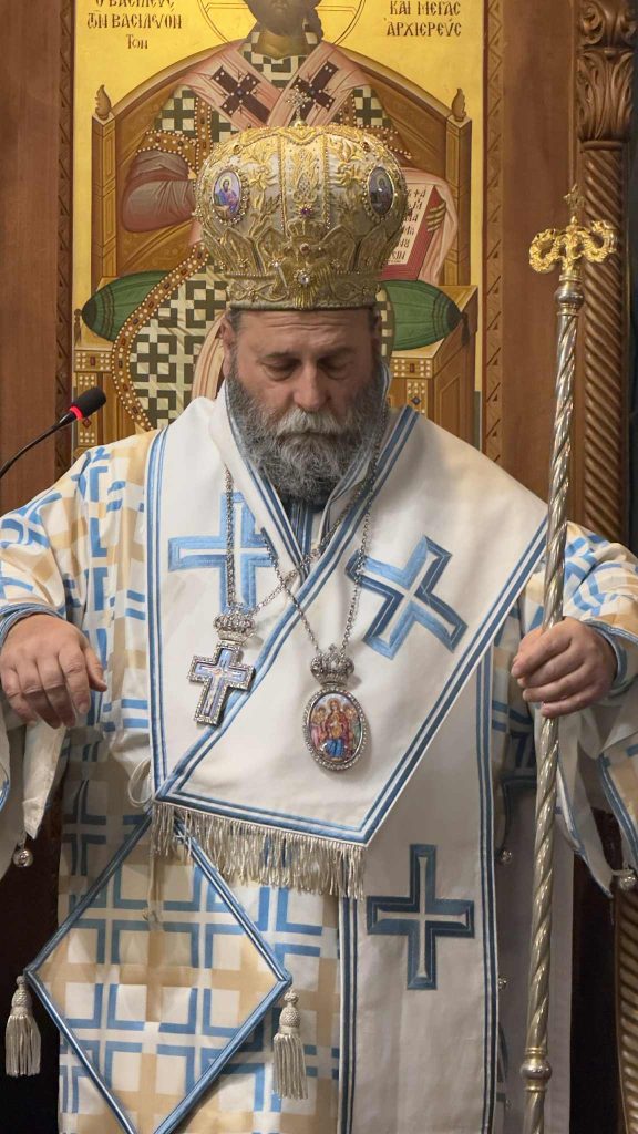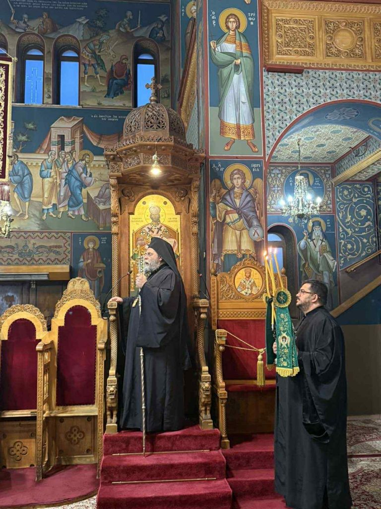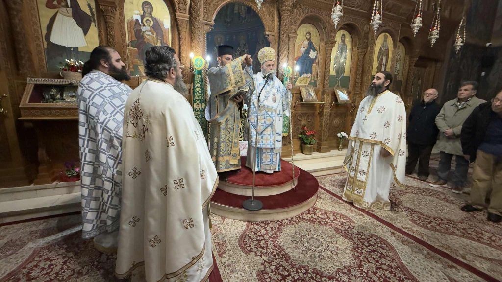 Το απόγευμα της ιδίας ο Σεβασμιώτατος χοροστάτησε στην ακολουθία του εσπερινού του Σαββάτου στον ως άνω Ιερό προσκυνηματικό ναό του πολιούχου.